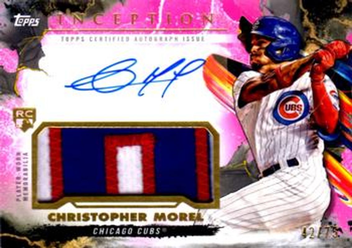 The Christopher Morel 2023 Topps Inception #IAP-CM Inception Autographs Patch - Magenta /75 Rookie card is 1 of 39 Christopher Morel's card variations in the 2023 Topps Inception set being tracked by Sports Card Investor, including Base, Green, Purple /150, Magenta /99, and Red /75.