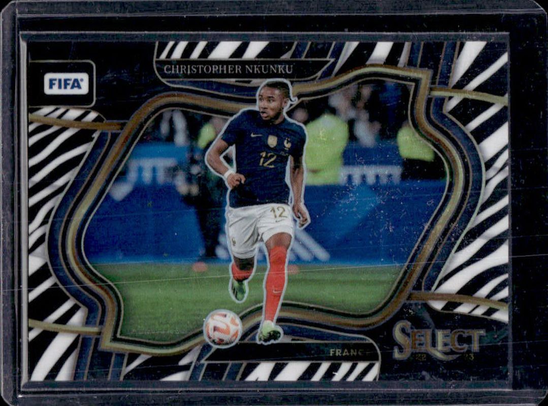 The Christopher Nkunku 2022 Select FIFA #216 Zebra /25 card is 1 of 20 Christopher Nkunku's card variations in the 2022 Select FIFA set being tracked by Sports Card Investor, including Base, Blue, Checkerboard, Multi Color, and Peacock.