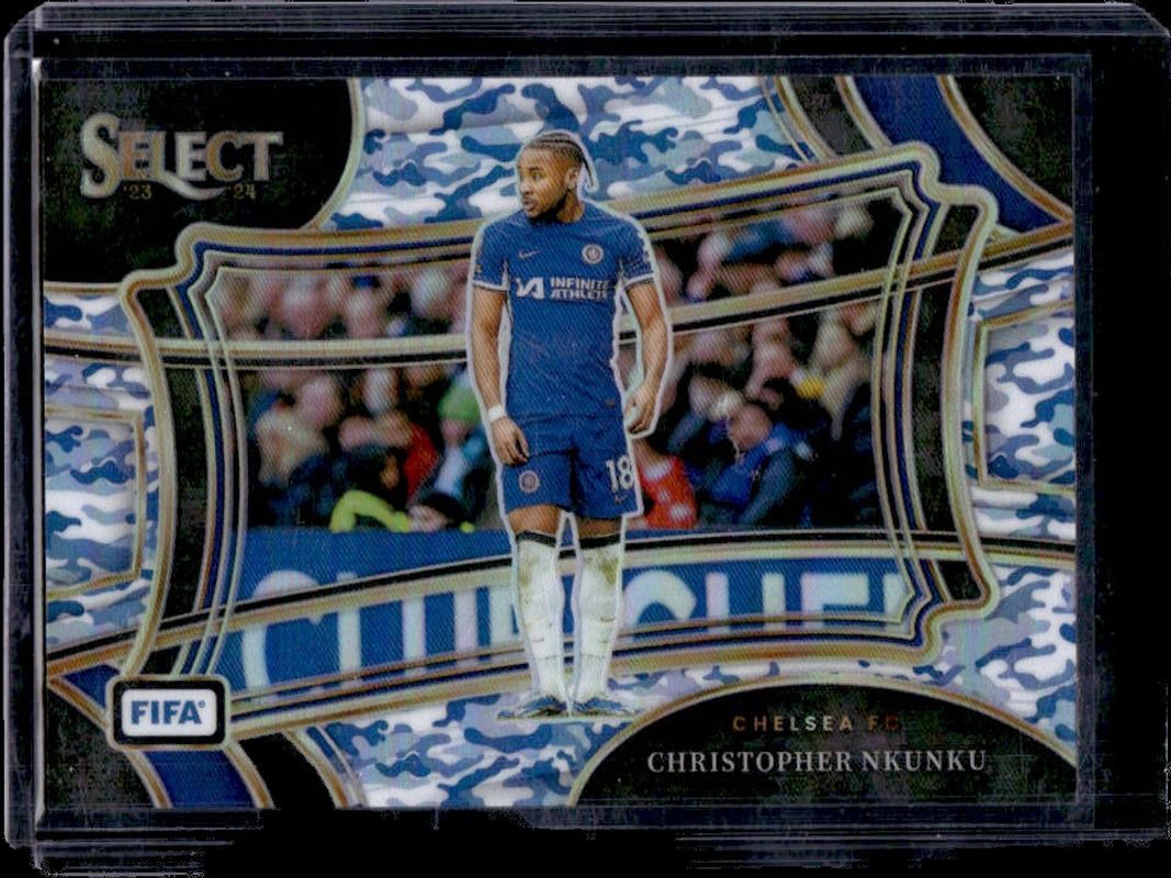 The Christopher Nkunku 2023 Select FIFA #240 Winter Camo /99 card is 1 of 48 Christopher Nkunku's card variations in the 2023 Select FIFA set being tracked by Sports Card Investor, including #105 Base, #240 Base, #105 Blue, #240 Blue, and #105 Checkerboard.