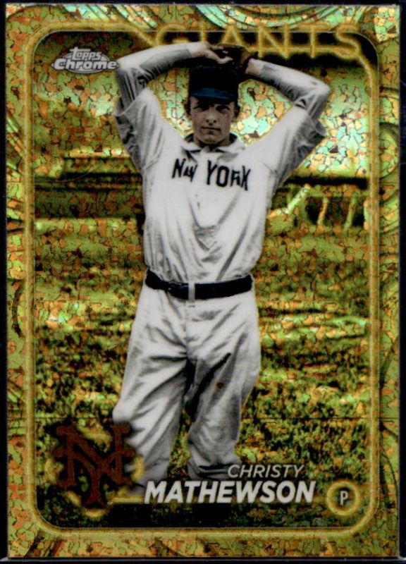The Christy Mathewson 2024 Topps Gilded Collection #56 Mini-Diamond Refractor /50 card is 1 of 7 Christy Mathewson's card variations in the 2024 Topps Gilded Collection set being tracked by Sports Card Investor, including Base /99, Gold Wave Refractor /75, Gold RayWave Refractor /25, Gold Lava Refractor /10, and Electroplate Refractor /5.