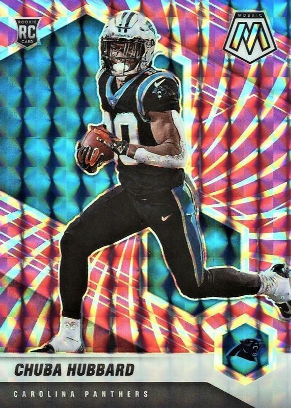 This card is 1 of 39 Chuba Hubbard's card variations in the 2021 Mosaic set being tracked by Sports Card Investor, including Base, Choice Red & Green, Green, No Huddle, and Pink Camo.