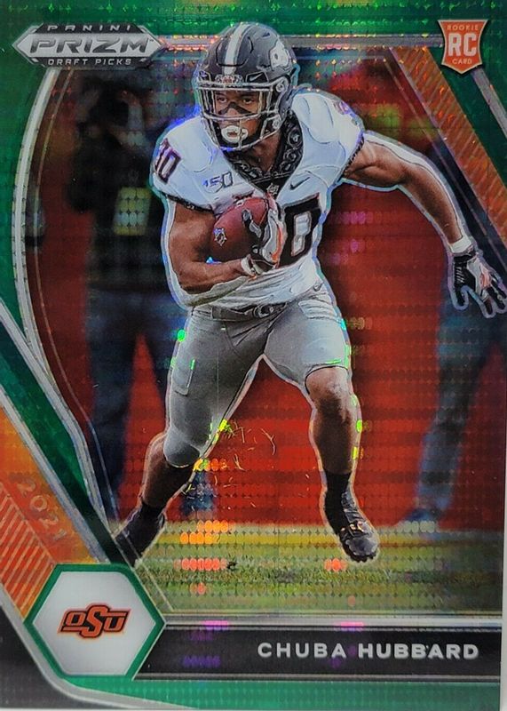 The Chuba Hubbard 2021 Prizm Draft Picks #125 Green Pulsar /25 Rookie card in Raw condition has not changed in price in the last 30 days and was last sold for $2.99 .