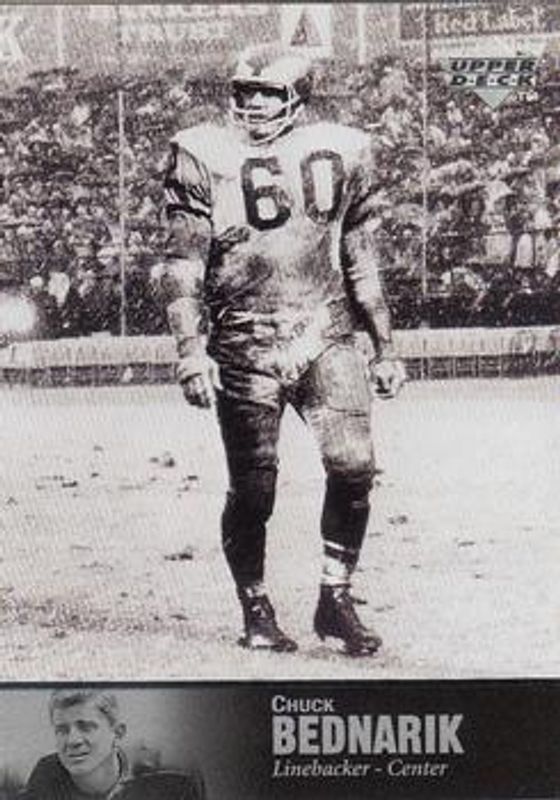 The Chuck Bednarik 1997 Upper Deck Legends #22 Base card is 1 of 2 Chuck Bednarik's card variations in the 1997 Upper Deck Legends set being tracked by Sports Card Investor, including Autographs.