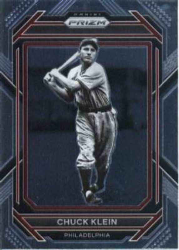 The Chuck Klein 2023 Prizm #182 Base card is 1 of 26 Chuck Klein's card variations in the 2023 Prizm set being tracked by Sports Card Investor, including Blue Ice, Giraffe, Green Ice, Hyper, and Ice.