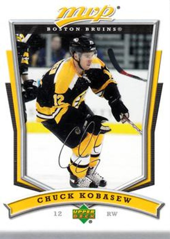The Chuck Kobasew 2007 Upper Deck MVP #45 Base card is 1 of 3 Chuck Kobasew's card variations in the 2007 Upper Deck MVP set being tracked by Sports Card Investor, including Gold Scripts /100, and Super Scripts /25.