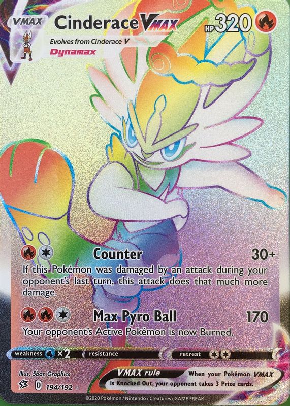 The Cinderace VMAX 2020 Sword & Shield: Rebel Clash #194/192 Holo (Secret) card in Raw TCG (Near Mint) condition has moved up $5.01 (+50.2%) in the last 30 days and was last sold for $15.00 .