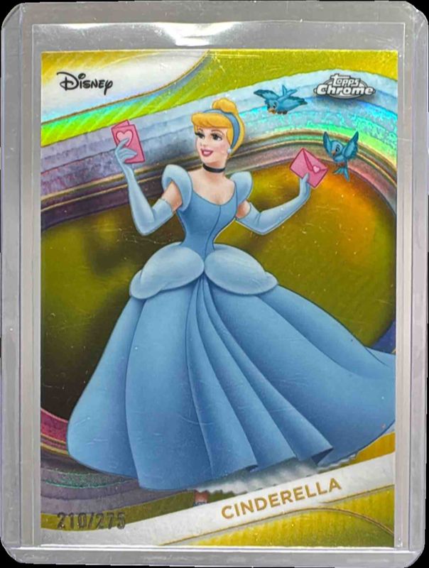 The Cinderella 2025 Topps Chrome Disney #75 Yellow Refractor /275 card is 1 of 37 Cinderella's card variations in the 2025 Topps Chrome Disney set being tracked by Sports Card Investor, including Base, Mini Diamonds Refractor, Prism Refractor, Refractor, and Yellow Mini Diamonds Refractor.