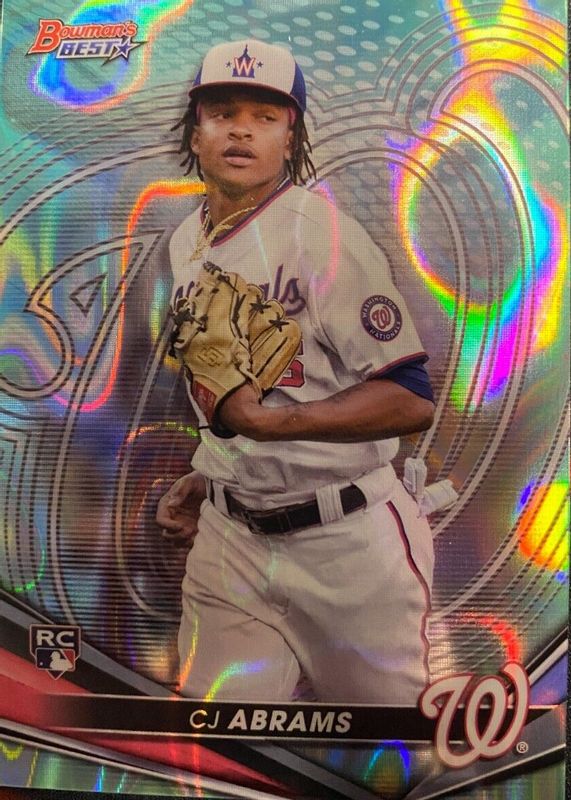 This card is 1 of 17 CJ Abrams' card variations in the 2022 Bowman's Best set being tracked by Sports Card Investor, including Base, Atomic Refractor, Refractor, Mini-Diamond Refractor /299, and Purple Refractor /250.