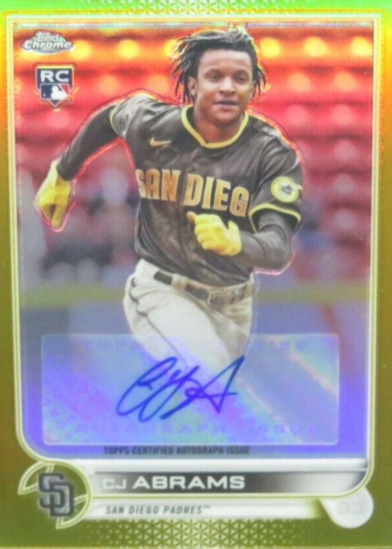 The CJ Abrams 2022 Topps Chrome #RA-CA Rookie Auto - Gold Refractor /50 card in Raw condition has not changed in price in the last 30 days and was last sold for $76.00 .