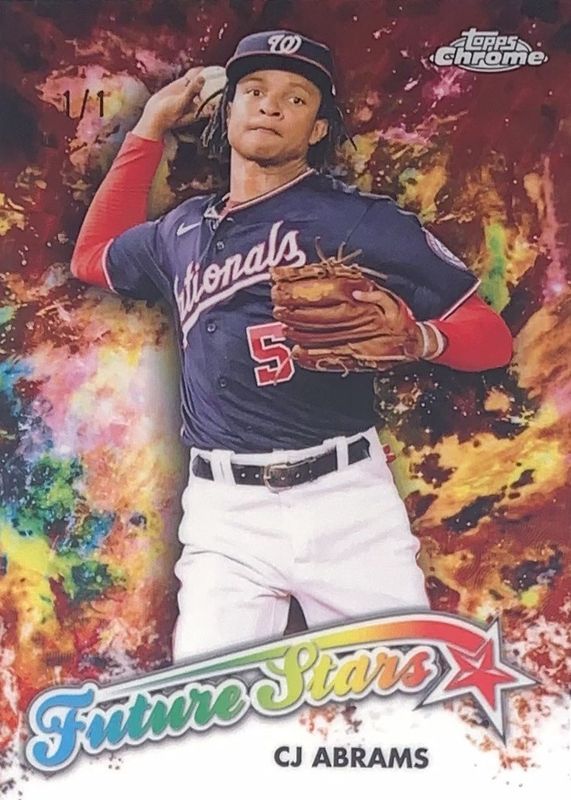 This card is 1 of 11 CJ Abrams' card variations in the 2023 Topps Chrome set being tracked by Sports Card Investor, including Future Stars - Green Refractor /99, Youthquake - Green Refractor /99, Future Stars - Gold Refractor /50, Youthquake - Gold Refractor /50, and Future Stars - Orange Refractor /25.