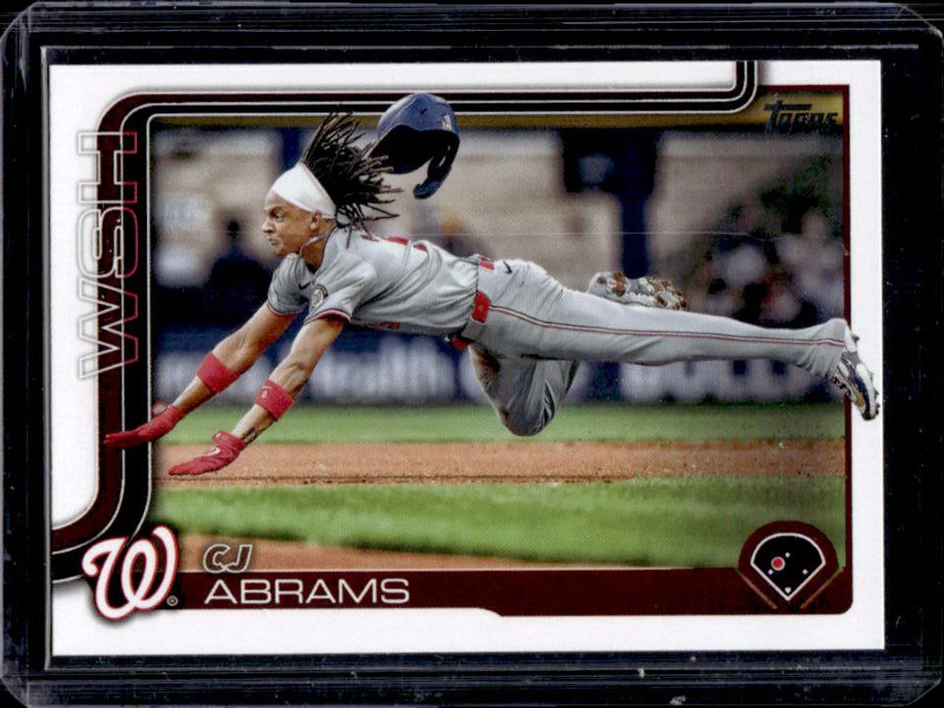 The CJ Abrams 2025 Topps #122 Base card is 1 of 107 CJ Abrams' card variations in the 2025 Topps set being tracked by Sports Card Investor, including Aqua Holo Foil, Diamante Foil, Holo Foil, Pink Diamante Foil, and Pink Holo Foil.