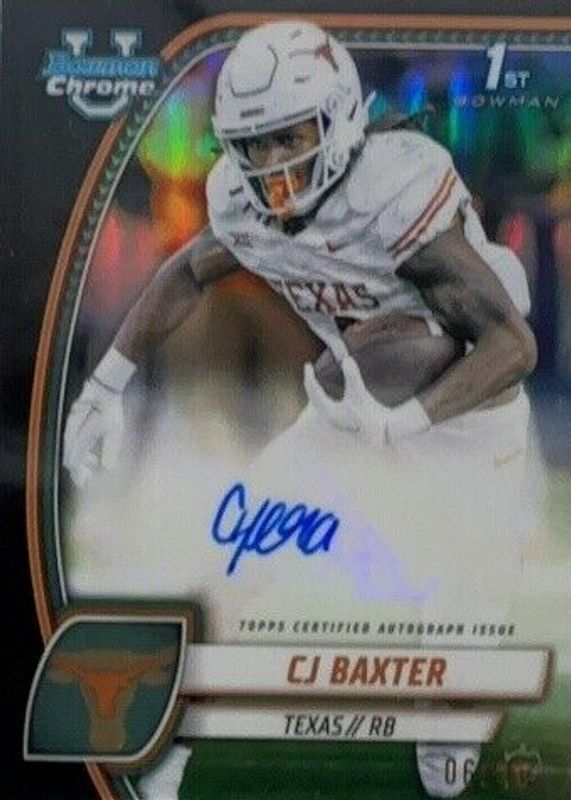 This card is 1 of 17 CJ Baxter's card variations in the 2024 Bowman Chrome University set being tracked by Sports Card Investor, including Image Variation (1st), Prospect Auto (1st), Prospect Auto - Stealth Refractor (1st), Prospect Auto - Refractor /299 (1st), and Prospect Auto - Fuchsia Refractor /150 (1st).