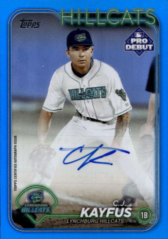 The CJ Kayfus 2024 Topps Pro Debut #PD-15 Base Autographs - Blue /150 card is 1 of 37 CJ Kayfus' card variations in the 2024 Topps Pro Debut set being tracked by Sports Card Investor, including Base, Fuchsia Foil /199, Sparkle Foil /175, Blue Foil /150, and Green Foil /99.