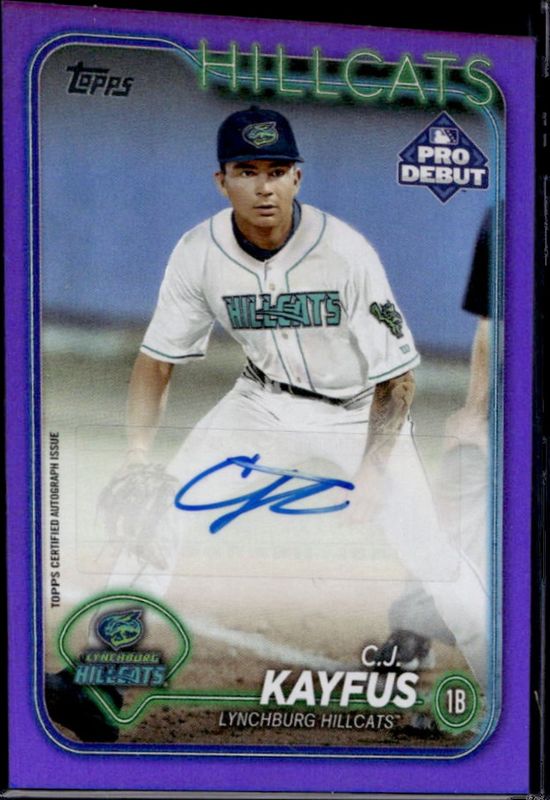 The CJ Kayfus 2024 Topps Pro Debut #PD-15 Base Autographs - Purple Foil /299 card is 1 of 37 CJ Kayfus' card variations in the 2024 Topps Pro Debut set being tracked by Sports Card Investor, including Base, Fuchsia Foil /199, Sparkle Foil /175, Blue Foil /150, and Green Foil /99.