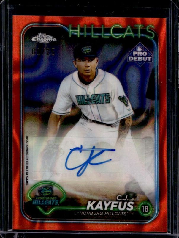 The CJ Kayfus 2024 Topps Pro Debut #PDC-15 Chrome Autographs - Orange Lava Refractor /25 card is 1 of 37 CJ Kayfus' card variations in the 2024 Topps Pro Debut set being tracked by Sports Card Investor, including Base, Fuchsia Foil /199, Sparkle Foil /175, Blue Foil /150, and Green Foil /99.