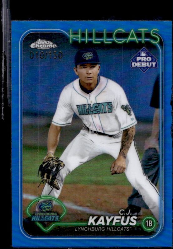 The CJ Kayfus 2024 Topps Pro Debut #PDC-15 Chrome - Blue Refractor /150 card is 1 of 37 CJ Kayfus' card variations in the 2024 Topps Pro Debut set being tracked by Sports Card Investor, including Base, Fuchsia Foil /199, Sparkle Foil /175, Blue Foil /150, and Green Foil /99.