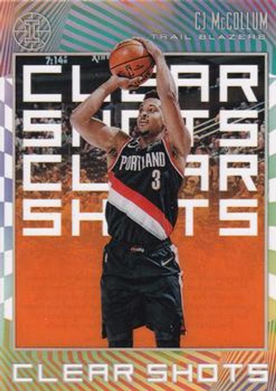 The CJ McCollum 2019 Illusions #2 Clear Shots - Orange card is 1 of 53 CJ McCollum's card variations in the 2019 Illusions set being tracked by Sports Card Investor, including Base, Trophy Collection Bronze, Trophy Collection Emerald, Trophy Collection Orange, and Trophy Collection Pink.