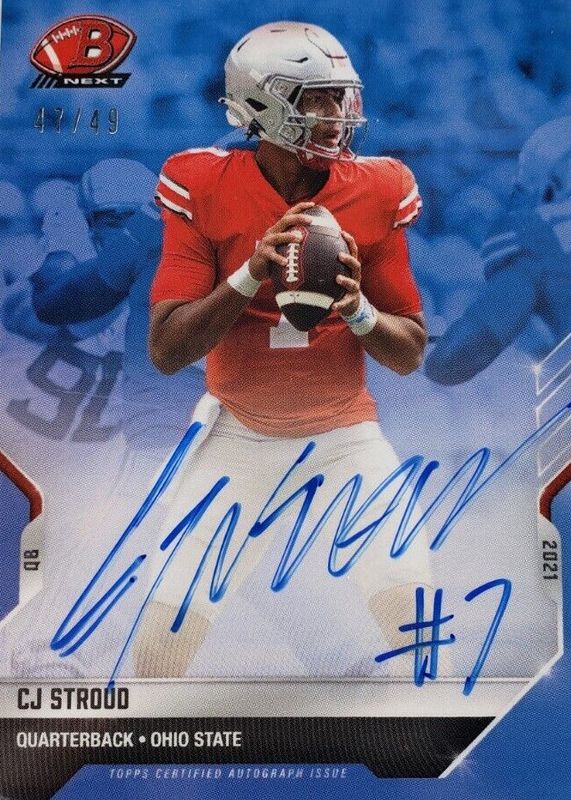The CJ Stroud 2021 Bowman Next #10 Autographs - Blue /49 card in Raw condition has not changed in price in the last 30 days and was last sold for $108.00 .