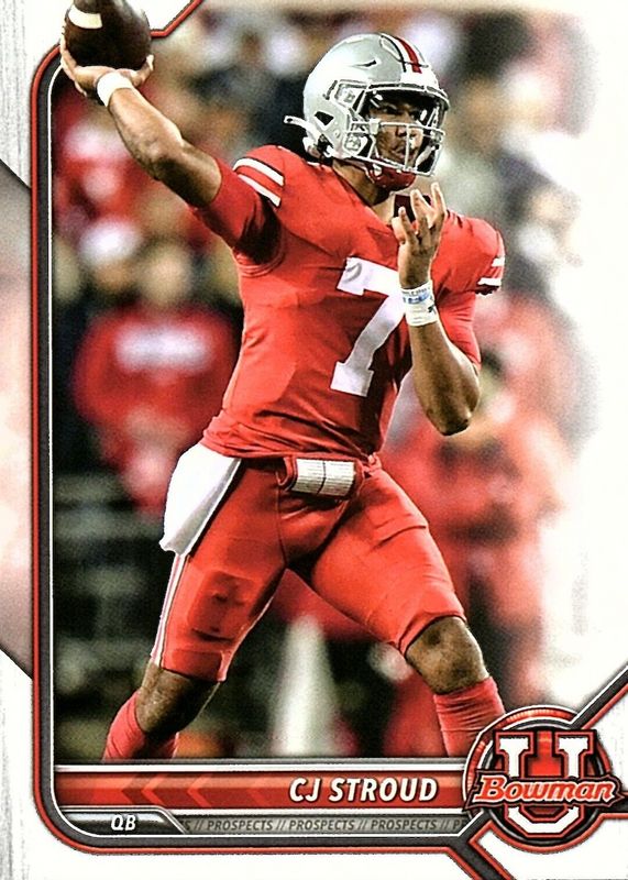 This card is 1 of 34 CJ Stroud's card variations in the 2021 Bowman University set being tracked by Sports Card Investor, including Paper Prospects (1st), Chrome Prospects - Pink Refractor (1st), Chrome Prospects - Purple Refractor (1st), Chrome Prospects - Refractor (1st), and Chrome Prospects - Refractor.