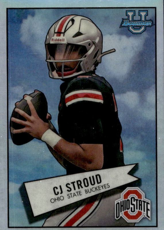 The CJ Stroud 2022 Bowman Chrome University #52BF-2 1952 Bowman card in Raw condition has moved up $0.99 (+99.0%) in the last 30 days and was last sold for $1.99 .