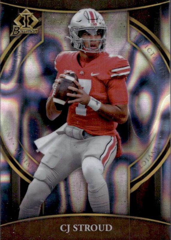 This card is 1 of 49 CJ Stroud's card variations in the 2022 Bowman Chrome University set being tracked by Sports Card Investor, including Prospects, Prospects - Pink Refractor, Prospects - Purple Shimmer Refractor, Prospects - Refractor, and Prospects - SP Variation (T-Shirt).