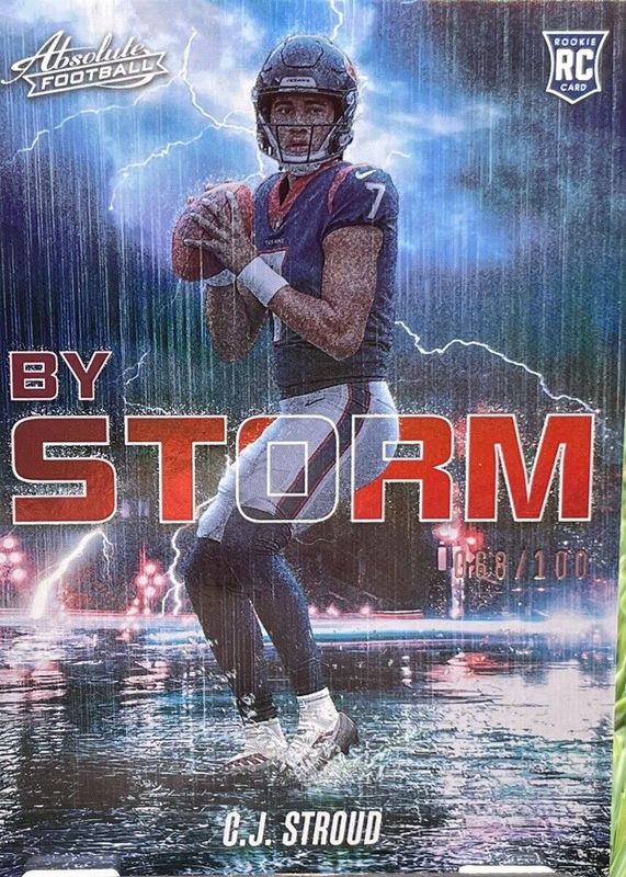 The CJ Stroud 2023 Absolute #BST-2 By Storm - Red /100 Rookie card in Raw condition has not changed in price in the last 30 days and was last sold for $6.55 .
