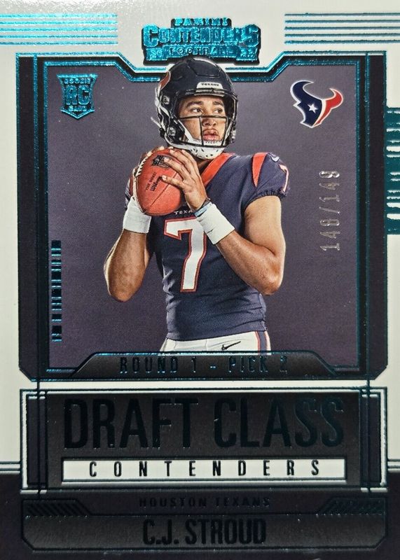 The CJ Stroud 2023 Contenders #5 Draft Class Contenders - Teal /149 Rookie card in Raw condition has not changed in price in the last 30 days and was last sold for $6.50 .