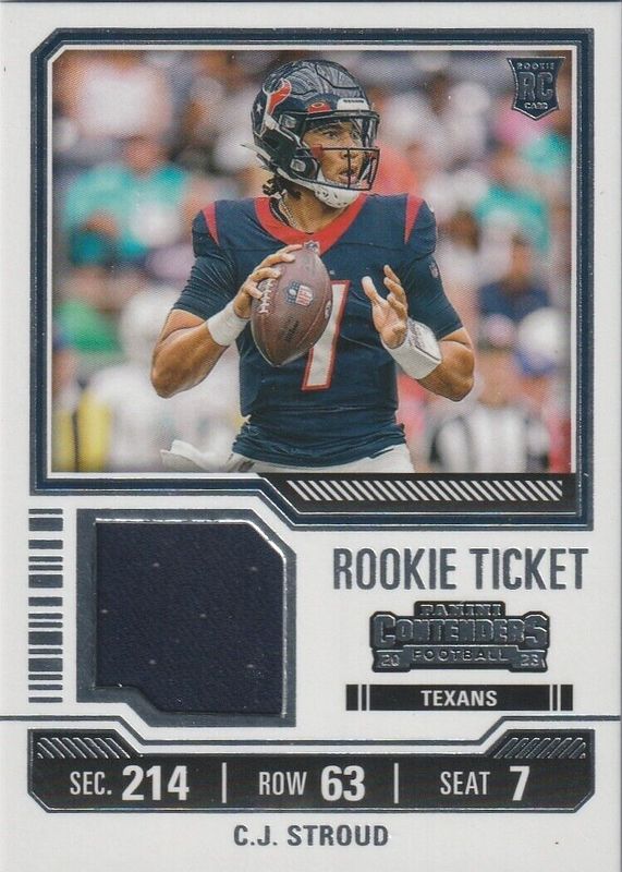The CJ Stroud 2023 Contenders #TS42 Rookie Ticket Swatches card in Raw condition has moved up $1.00 (+25.1%) in the last 30 days and was last sold for $4.99 .