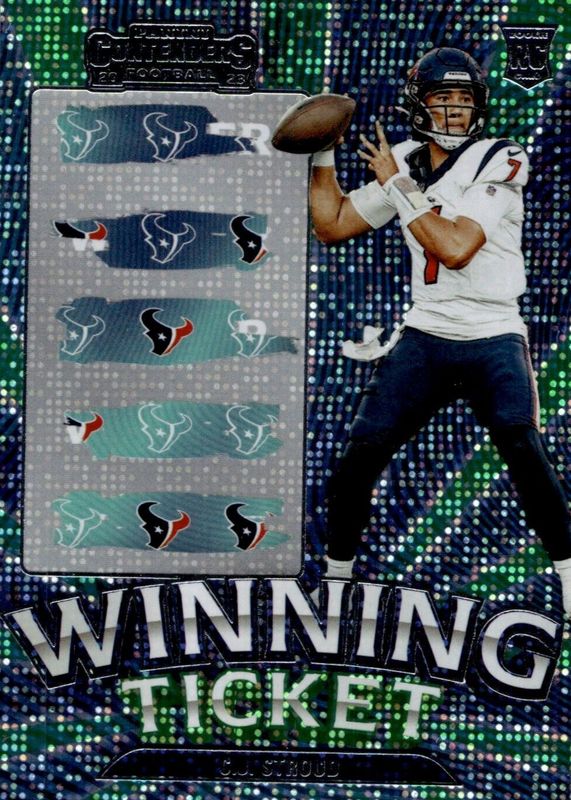 The CJ Stroud 2023 Contenders #19 Winning Ticket Rookie card in Raw condition has moved up $3.74 (+136%) in the last 30 days and was last sold for $6.50 .