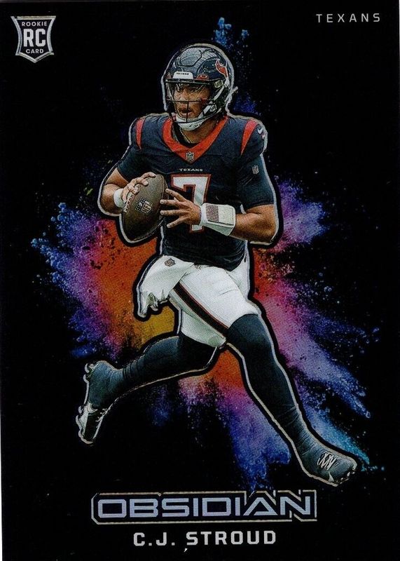 This card is 1 of 58 CJ Stroud's card variations in the 2023 Obsidian set being tracked by Sports Card Investor, including Base, Asia, Electric Etch Red Flood /90, Electric Etch Purple /75, and Electric Etch Contra /(SSP).