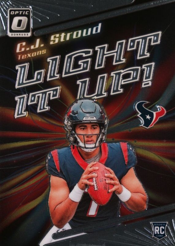 The CJ Stroud 2023 Optic #LU-CJ Light It Up Rookie card in Raw condition has moved up $14.00 (+1,414%) in the last 30 days and was last sold for $14.99 .