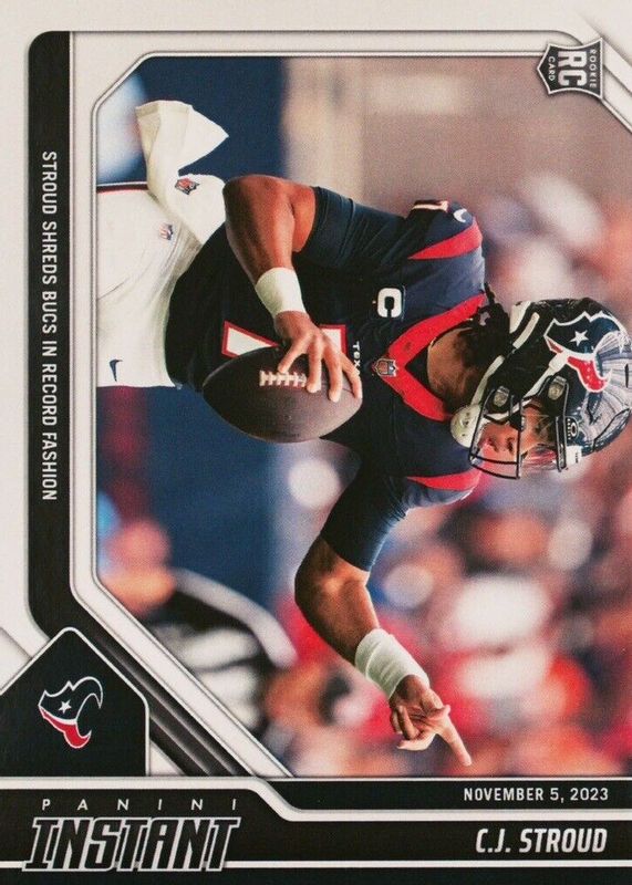The CJ Stroud 2023 Panini Instant #33 Base (Print Run: 2,160) Rookie card in Raw condition has moved up $1.50 (+37.5%) in the last 30 days and was last sold for $5.50 .