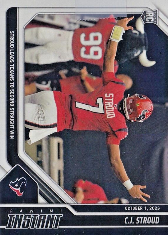 The CJ Stroud 2023 Panini Instant #8 Base (Print Run: 569) Rookie card in Raw condition has not changed in price in the last 30 days and was last sold for $2.99 .