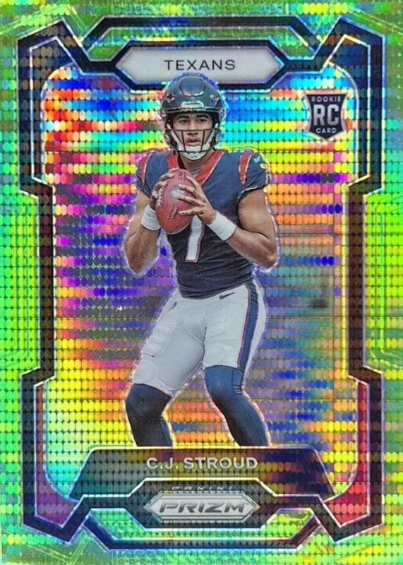 The CJ Stroud 2023 Prizm #339 Neon Green Pulsar Rookie card in Raw condition has moved up $9.00 (+36.0%) in the last 30 days and was last sold for $34.00 .