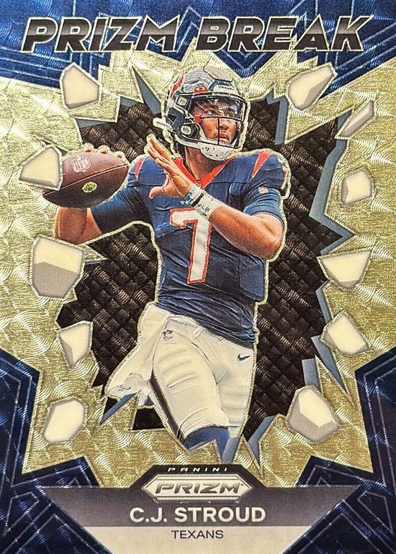 The CJ Stroud 2023 Prizm #PB-6 Prizm Break - Gold Vinyl /5 Rookie card in Raw condition has not changed in price in the last 30 days and was last sold for $2,500.00 .