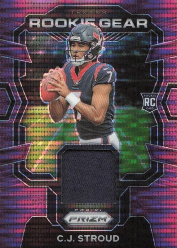 The CJ Stroud 2023 Prizm #RG-CJS Rookie Gear - Purple Pulsar card in Raw condition has not changed in price in the last 30 days and was last sold for $14.99 .