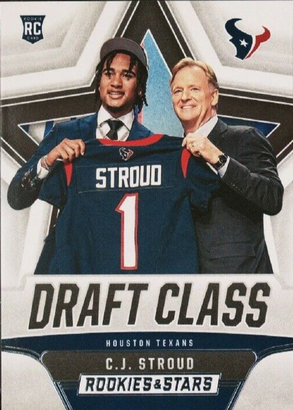The CJ Stroud 2023 Rookies & Stars #DC-4 Draft Class card in Raw condition has moved down -$0.70 (-34.4%) in the last 30 days and was last sold for $1.34 .