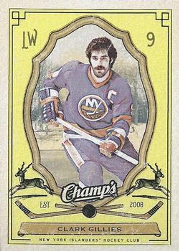 The Clark Gillies 2009 Upper Deck Champ's #64 Animal Icons card is 1 of 10 Clark Gillies' card variations in the 2009 Upper Deck Champ's set being tracked by Sports Card Investor, including #260 Base, #64 Base, #64 Green, #64 Red, and #64 Yellow.