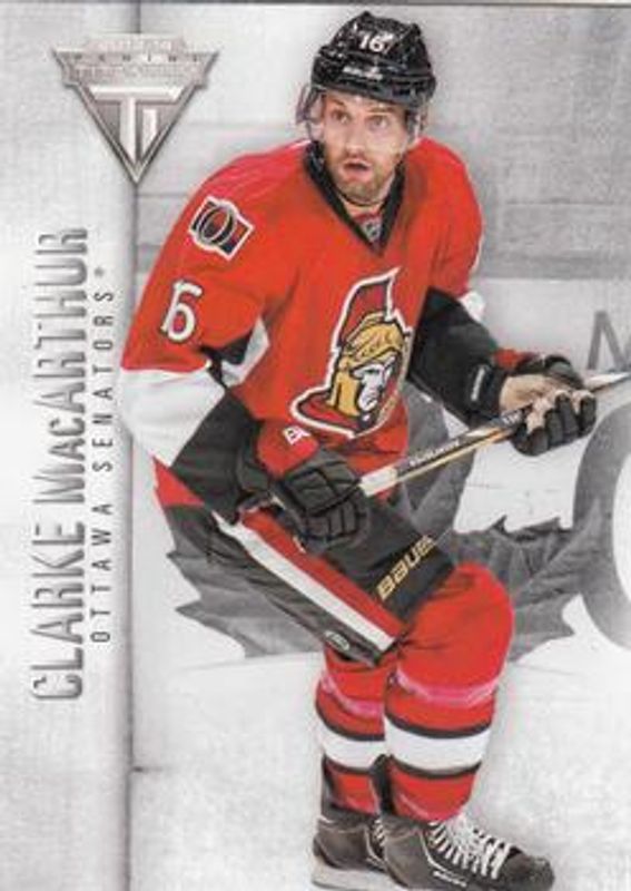 The Clarke MacArthur 2013 Titanium #14 Commons Retail /299 card is 1 of 10 Clarke MacArthur's card variations in the 2013 Titanium set being tracked by Sports Card Investor, including Base /91, Commons Retail Red /99, Hobby Draft Position /20, Hobby Jersey Number /14, and Commons Retail Gold /10.