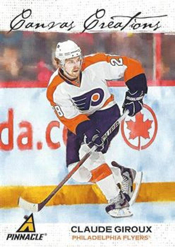The Claude Giroux 2011 Pinnacle #7 Canvas Creations card is 1 of 17 Claude Giroux's card variations in the 2011 Pinnacle set being tracked by Sports Card Investor, including Base, Rink Collection, Printing Plate Black /1, Printing Plate Cyan /1, and Printing Plate Magenta /1.