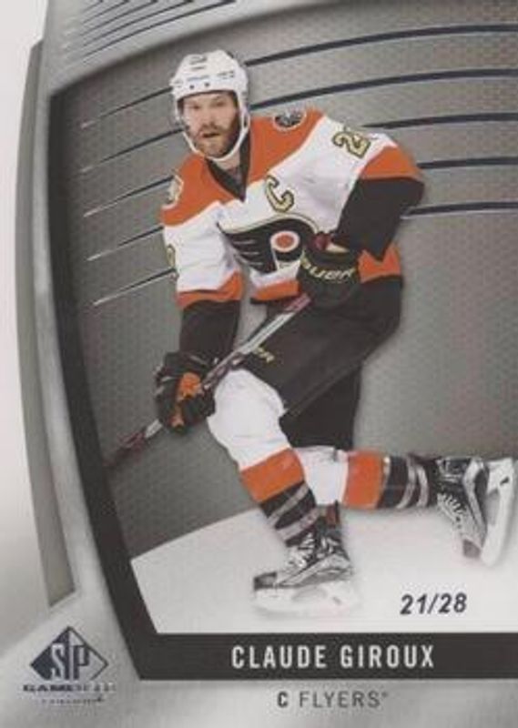 The Claude Giroux 2017 SP Game Used #56 Base /73 card is 1 of 10 Claude Giroux's card variations in the 2017 SP Game Used set being tracked by Sports Card Investor, including Gold Jerseys /399, Orange Rainbow /113, Spectrum Gold Premium Materials /49, Green Storm /1, and 2017 NHL Stadium Series Game Used Pucks.