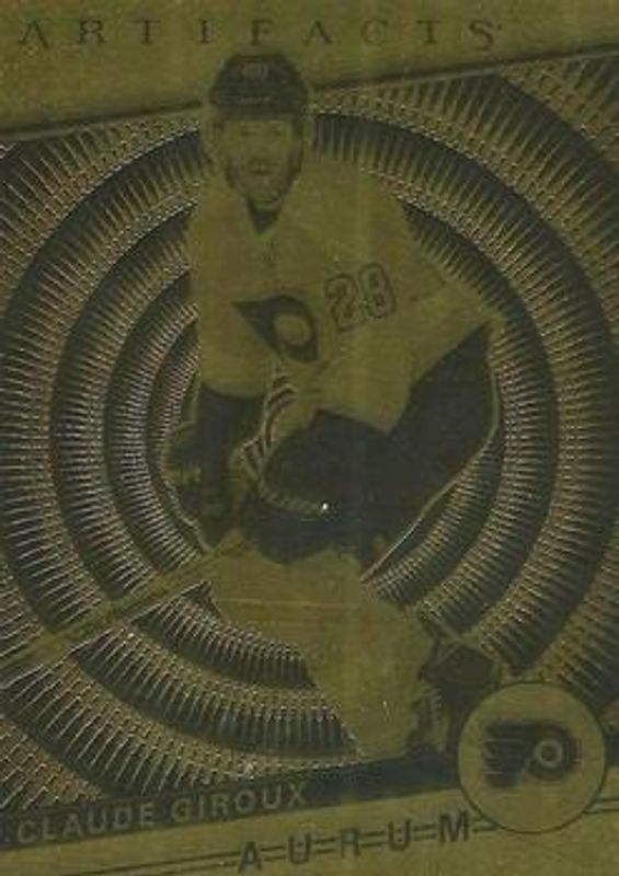 The Claude Giroux 2018 Upper Deck Artifacts #A-28 Aurum card is 1 of 13 Claude Giroux's card variations in the 2018 Upper Deck Artifacts set being tracked by Sports Card Investor, including Base /799, Ruby /349, Emerald /99, Aqua /45, and Purple /20.