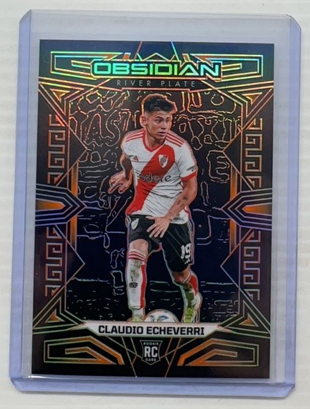 The Claudio Echeverri 2023 Obsidian #189 Electric Etch Orange /40 Rookie card is 1 of 14 Claudio Echeverri's card variations in the 2023 Obsidian set being tracked by Sports Card Investor, including Base /120, Electric Etch Red Pulsar /49, Electric Etch Red Crystals /30, Electric Etch Purple Flood /25, and Electric Etch Blue /20.