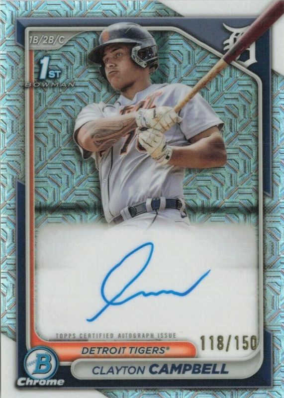 This card is 1 of 25 Clayton Campbell's card variations in the 2024 Bowman Chrome set being tracked by Sports Card Investor, including Prospect Auto (1st), Prospect Auto - Refractor /499 (1st), Prospect Auto - Speckle Refractor /299 (1st), Prospect Auto - Purple Refractor /250 (1st), and Prospect Auto - Blue RayWave Refractor /150 (1st).
