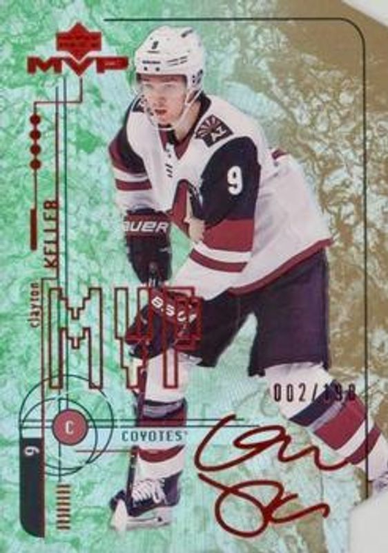 The Clayton Keller 2018 Upper Deck MVP #23 20th Anniversary Colors & Contours /198 card is 1 of 18 Clayton Keller's card variations in the 2018 Upper Deck MVP set being tracked by Sports Card Investor, including Base, Factory Set Blue, Green Script, Puzzle Back, and Silver Script.