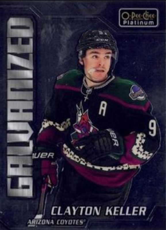 The Clayton Keller 2022 O-Pee-Chee Platinum #G-18 Galvanized card is 1 of 29 Clayton Keller's card variations in the 2022 O-Pee-Chee Platinum set being tracked by Sports Card Investor, including Base, Matte Pink, Neon Yellow Surge, Rainbow, and Sunset.