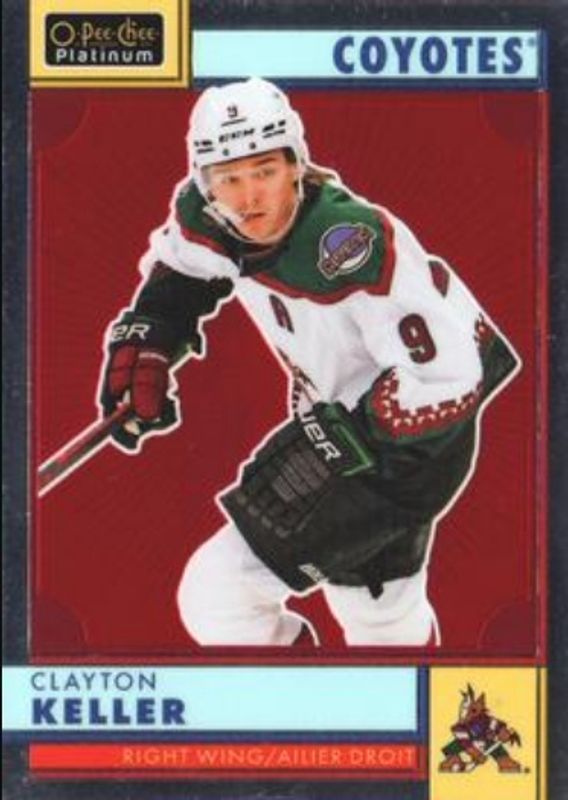 The Clayton Keller 2022 O-Pee-Chee Platinum #R-18 Retro card is 1 of 29 Clayton Keller's card variations in the 2022 O-Pee-Chee Platinum set being tracked by Sports Card Investor, including Base, Matte Pink, Neon Yellow Surge, Rainbow, and Sunset.