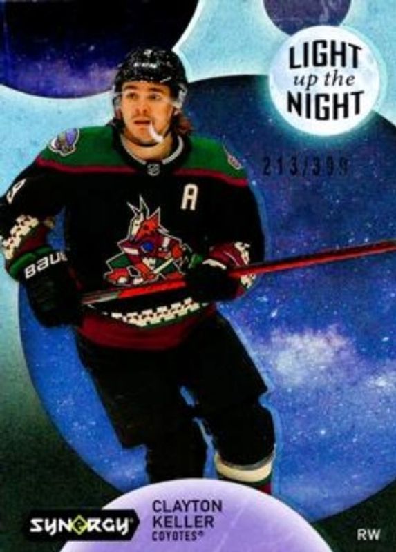 The Clayton Keller 2022 Upper Deck Synergy #LN-CK Light Up the Night - Blue /399 card is 1 of 8 Clayton Keller's card variations in the 2022 Upper Deck Synergy set being tracked by Sports Card Investor, including Base /23, Red, Red Codes, Gold /25, and Light Up the Night /899.