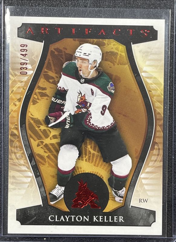 The Clayton Keller 2023 Upper Deck Artifacts #105 Ruby /499 card is 1 of 27 Clayton Keller's card variations in the 2023 Upper Deck Artifacts set being tracked by Sports Card Investor, including Base /999, Leather, Plexi, Turquoise, and Wood.