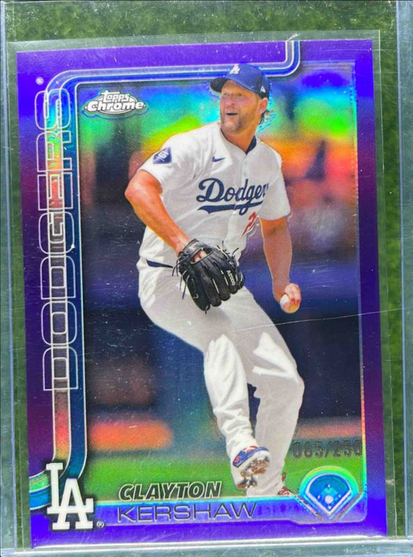 The Clayton Kershaw 2025 Topps Chrome #88 Purple Refractor /250 card is 1 of 65 Clayton Kershaw's card variations in the 2025 Topps Chrome set being tracked by Sports Card Investor, including Base, Geometric Refractor, Image Variation, Lightboard Logo Variation, and Negative Refractor.